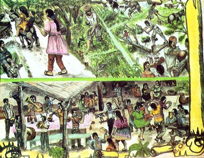 I would like to pay a special tribute to the popular artists from the rainforest region of Peru who participated in great numbers all through the years of the competition with beautiful and exciting images. It is worth noting that artists from the region won first place at a national level for three consecutive years - though I do not wish to take away in any way from the marvellous entries of other regions. If I was allowed more space here I would gladly take you on a tour of entries from the other regions. The painting that won the fifth Competition in 1988 depicted the construction of la Maloca, the Bora chief’s house and the artist Manuel Ruiz Mibeco tells us of the colours he used: pink, blue, yellow, red and green from crayons, and brown, bright green and black from natural dyes.